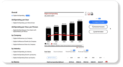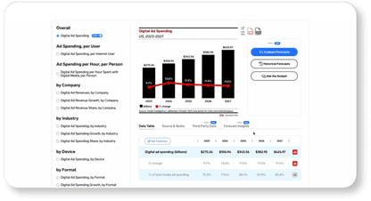 Through exclusive features like the Compare Tool, historical data, and additional data sets, EMARKETER data is more flexible than ever. Create charts, download forecasts, and manipulate the raw data to support your storytelling.